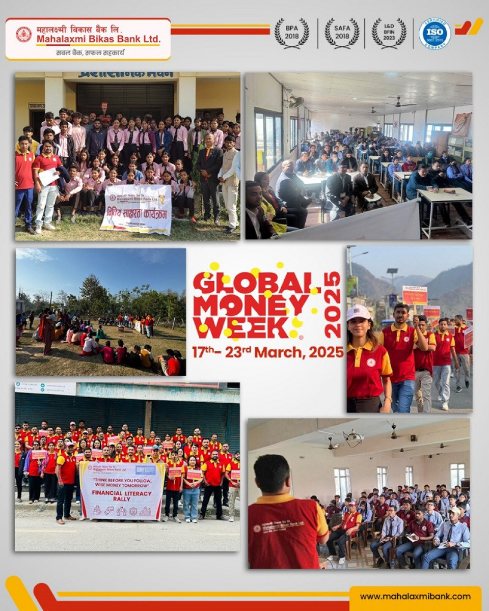 काठमाण्डौ । महालक्ष्मी विकास बैंकले ग्लोबल मनि विकको अवसरमा विभिन्न कार्यक्रमको आयोजना गरेको छ । बैंकले चैत ४ गतेदेखि १० गतेसम्म साताव्यापी रुपमा मनाइएको ग्लोबल मनि विक २०२५ को अवसरमा वित्तीय पहुँचबाट बाहिर रहेका विभिन्न लक्षित वर्गहरु पहिचान गरी बैंकका देशै भरी रहेको सातवटै प्रदेशमा रहेका विभिन्न शाखाहरु तथा प्रादेशिक कार्यालयहरुद्वारा वित्तीय साक्षरता, र्याली तथा सचेतनाका कार्यक्रमहरु सम्पन्न गरेको हो ।