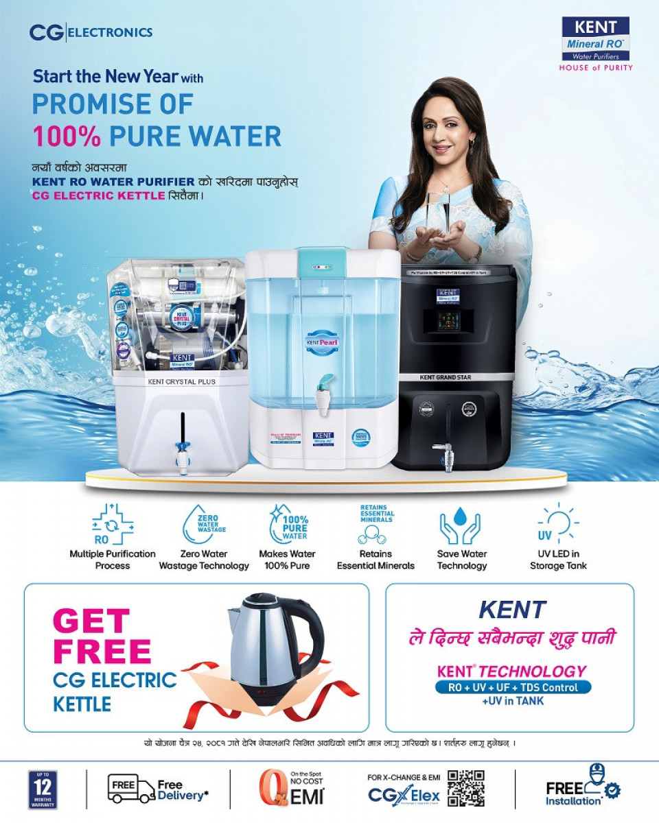 काठमाण्डौ । सिजी इलेकट्रोनिक्सअन्तर्गत केन्ट ब्रान्डले नयाँ वर्ष २०८२ को अवसरमा ‘Start a new year with PROMISE OF 100% PURE WATER’अभियानको शुभारम्भ गरेको घोषणा गरेको छ। यस अभियानले ग्राहकहरूलाई KENT Mineral RO Water Purifier मा आकर्षक अफर र विशेष उपहारहरू प्रदान गर्दै, नयाँ वर्षलाई स्वस्थ र स्वच्छ बनाउने लक्ष्य राखेको छ।