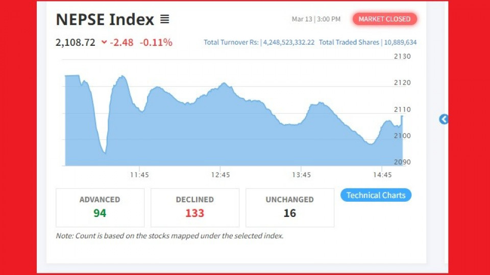 काठमाण्डौ । साताको चौथो कारोबार दिन आज नेपाल स्टक एक्सचेञ्च(नेप्से) परिसूचकमा झिनो अंकको करेक्सन आएको छ । आज नेप्से परिसूचक २.४८ अंक अर्थात ०.११ प्रतिशतले घटेर २ हजार १०८.७२ विन्दुमा सीमित बन्न पुगेको छ ।