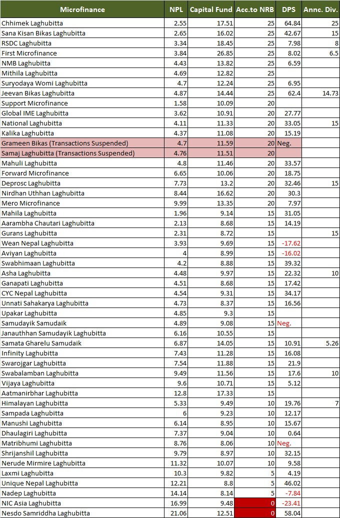 जसमा महिला, स्वाभिमान, आशा, गणपति, सिवाइसी नेपाल, उन्नती सहकार्य, इन्फिनिटी, स्वरोजगार र स्वाभिमान लघुवित्त रहेका छन् । जसमध्ये आशा लघुवित्त र स्वभिमान लघुवित्तले लाभांश घोषणा गरेका छन् । यी संस्थाहरुले पनि १५ प्रतिशतसम्मको लाभांश क्षमता राखेपनि १० प्रतिशतको दरले लाभांश प्रस्ताव गरेका छन् ।