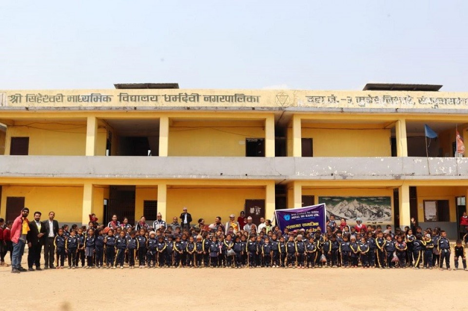 काठमाण्डौ । नेपाल एसबिआई बैंकले संखुवासभा जिल्लाको धर्मदेवी नगरपालिकामा रहेको सिंहेश्वरी माध्यमिक विद्यालयमा अध्ययनरत कक्षा एल के जी देखि कक्षा चार सम्मका विद्यार्थीहरुलाई १५३ थान ट्रयाक सुट प्रदान गरेको छ । बैंकले सामाजिक उत्तरदायित्व कार्यक्रम अन्तर्गत उक्त सहयोग प्रदान गरेको हो ।