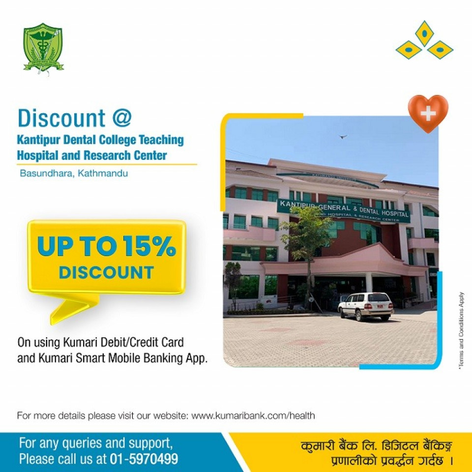 यस सम्झौताअनुसार कुमारी बैंक लिमिटेडका ग्राहकहरुले कान्तिपुर डेन्टल कलेज टिचिङ अस्पतालबाट सेवा लिएबापत कुनै पनि भुक्तानी कुमारी बैंकको डेबिट÷क्रेडिट कार्डबाट गर्दा ओपिडि सामान्य डेन्टल सेवाहरूमा कान्तिपुर डेन्टल कलेज टिचिङ अस्पताल तथा रिसर्च केन्द्र, काठमाण्डौ मूख्य कार्यालय तथा नारायणगढरबुटवलमा रहेका शाखा कार्यालयहरुबाट सेवा लिदा १०%, विशेष डेन्टल सेवाहरूमा ७%, सामान्य सेवाहरूमा १०%, क्लिनिकल प्याथोलोजीमा १५% छुट र साथै पहिलो भिजिटमा नि:शुल्क आँखा परीक्षण प्राप्त गर्न सकिनेछ ।