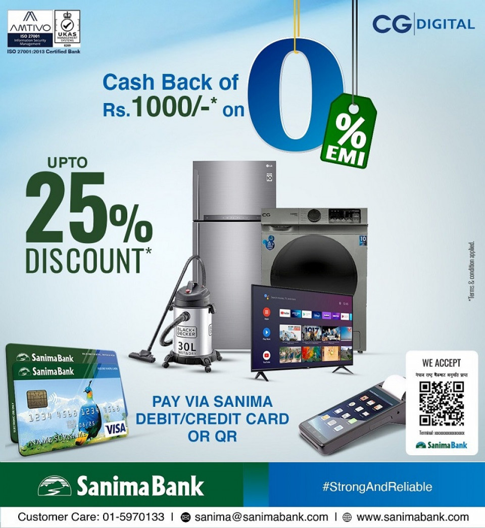 यसअन्तर्गत सानिमा डेबिट तथा क्रेडिट कार्ड वा सानिमा मोबाइल बैंकिङ (क्यूआर स्क्यान) मार्फत सिजी डिजिटलमा सामान खरिद गरी डिजिटल भुक्तानी गर्दा ग्राहकहरुलाई २५ प्रतिशतसम्म छुटको व्यवस्था गरिएको छ ।