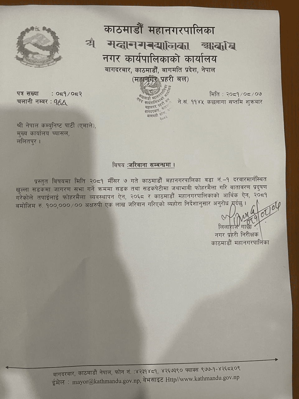 महानगरले एमाले पार्टी कार्यालयको नाममा पठाएको पत्रमा भनिएको छ,‘प्रस्तुत विषयमा मिति २०८१ मंसिर ७ गते काठमाडौँ महानगरपालिका वडा नं.१ दरबारमार्गस्थित खुला सडकमा जागरण सभा गर्ने क्रममा सडक तथा सडकपेटीमा जथाभाबी फोहरमैला गरी वातावरण प्रदूषण गरेकोले तपाईँलाई फोहरमैला व्यवस्थापन ऐन, २०६८ र काठमाडौँ महानगरपालिकाको आर्थिक ऐन, २०८१ बमोजिम रु.१००,०००(अक्षरुपी एक लाख) जरिवाना गरिएको ब्यहोरा निर्देशानुसार अनुरोध गर्दछु ।’