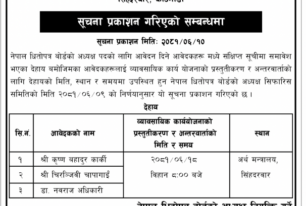 धितोपत्र बोर्डको अध्यक्ष छनौटको पुरानै प्रक्रिया ब्यूँताइयो, अनुपस्थित ३ जनालाई प्रस्तुतीकरणमा बोलाइयो